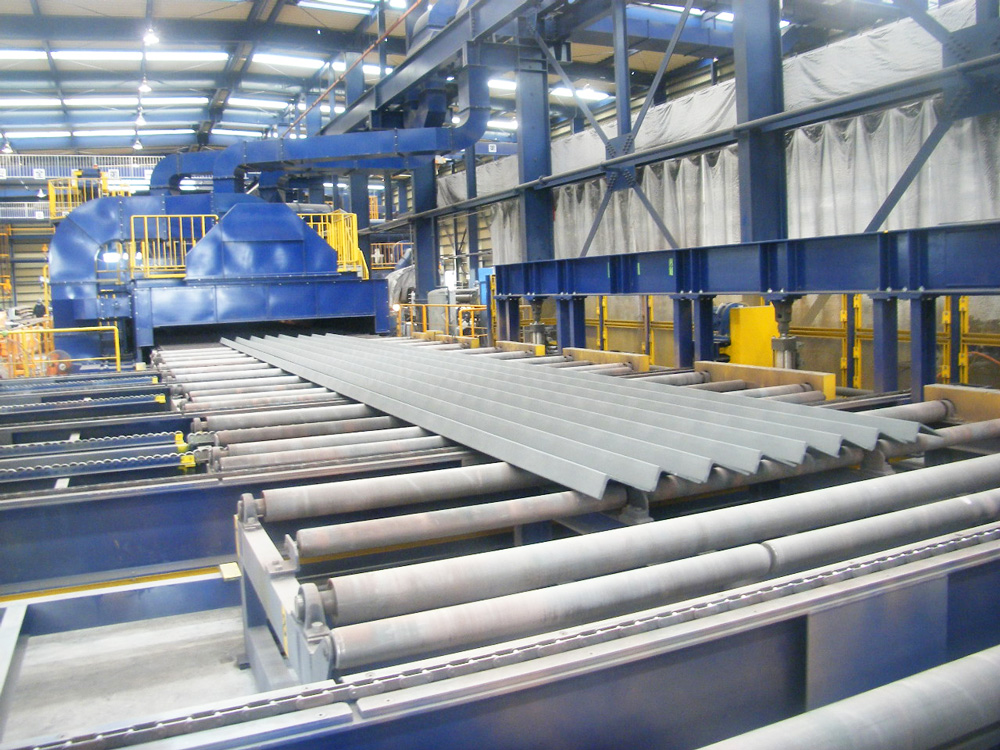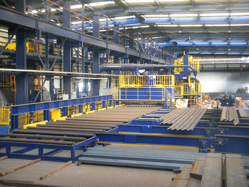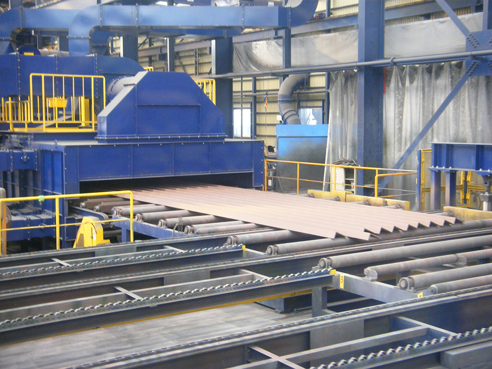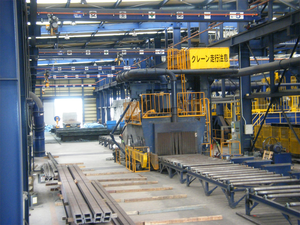 ショットブラストラインにて、あらゆる形状の鋼材や広巾鋼板を小ロットの加工から大量生産まで可能な工場です。
