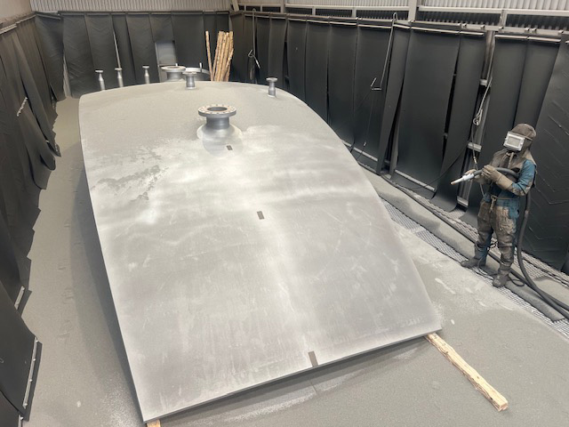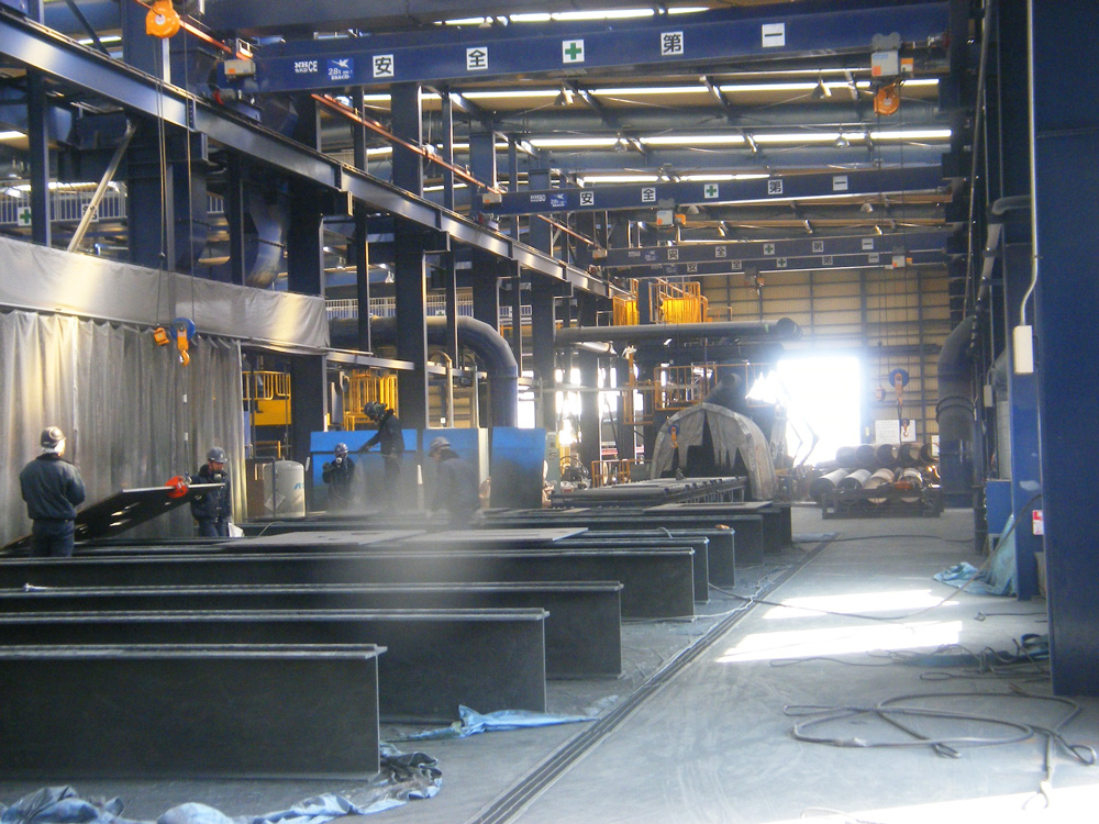 弊社の敷地には、第一工場、第二工場、第三工場および5つの塗装テントブースがあり、あらゆる形状、鋼板、鋼材・大小鋼構造物をショットブラスト加工など行う一次表面処理から重防食塗装などの特殊防錆加工を一貫してできる総合防錆加工工場があります。