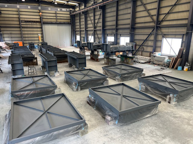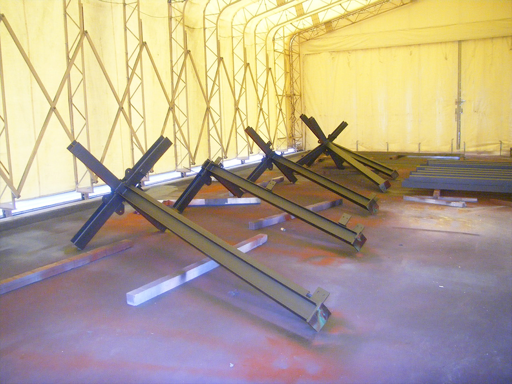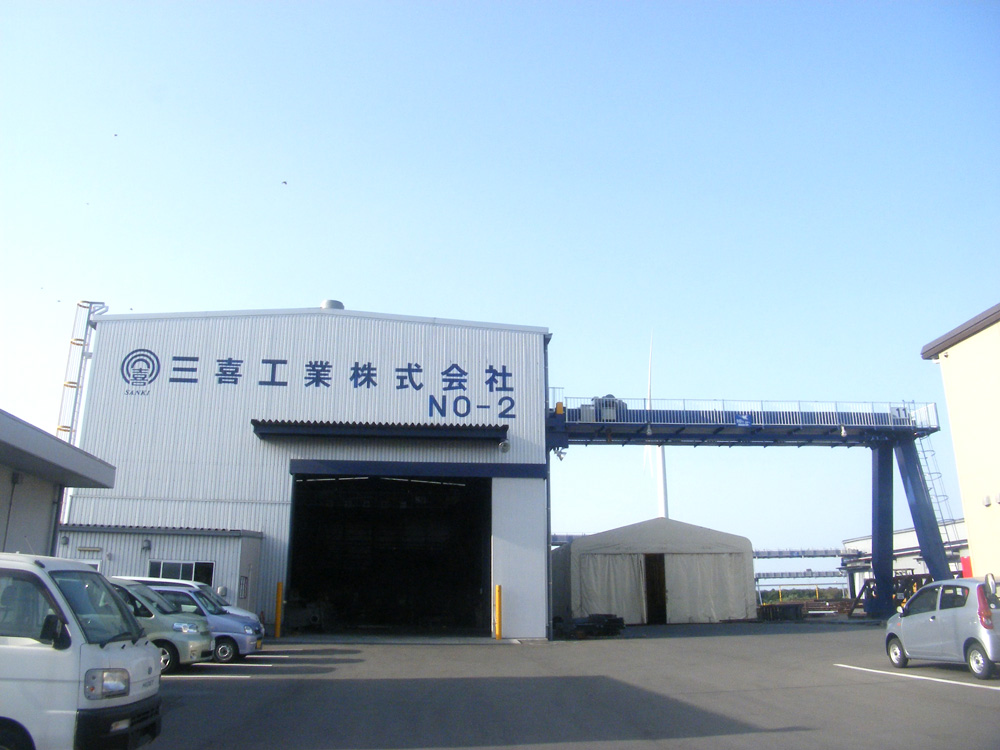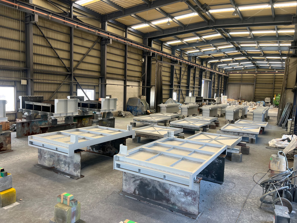 工場内に大型ブラスト室と最新鋭エアーブラスト設備、大型天井クレーンを設備し、屋外には稼動テント式塗装ブースと大型橋脚クレーンを設備しています。そうすることにより天候に左右されず、尚且つ様々な用途に合わせて加工ができる工場です。